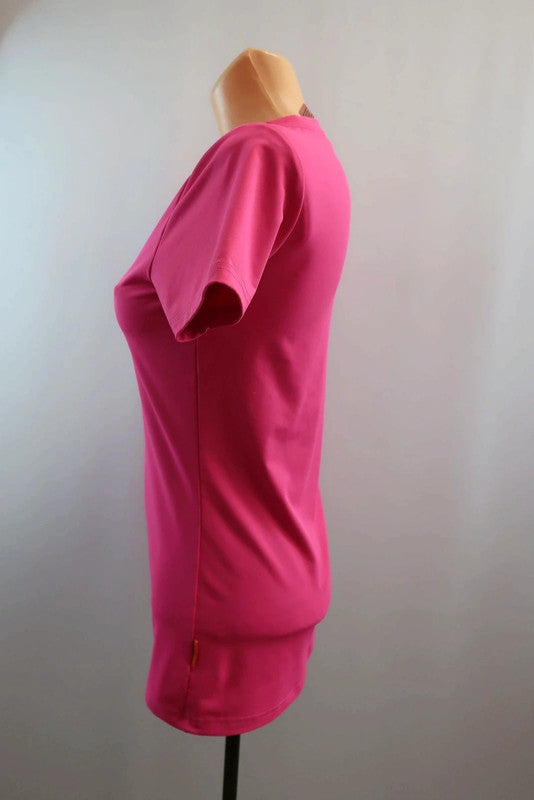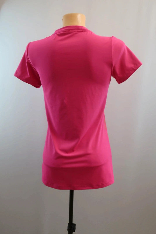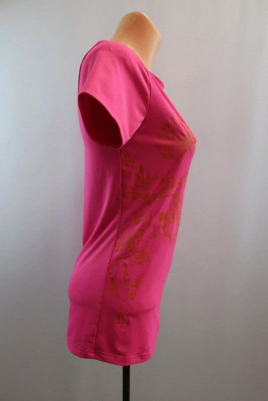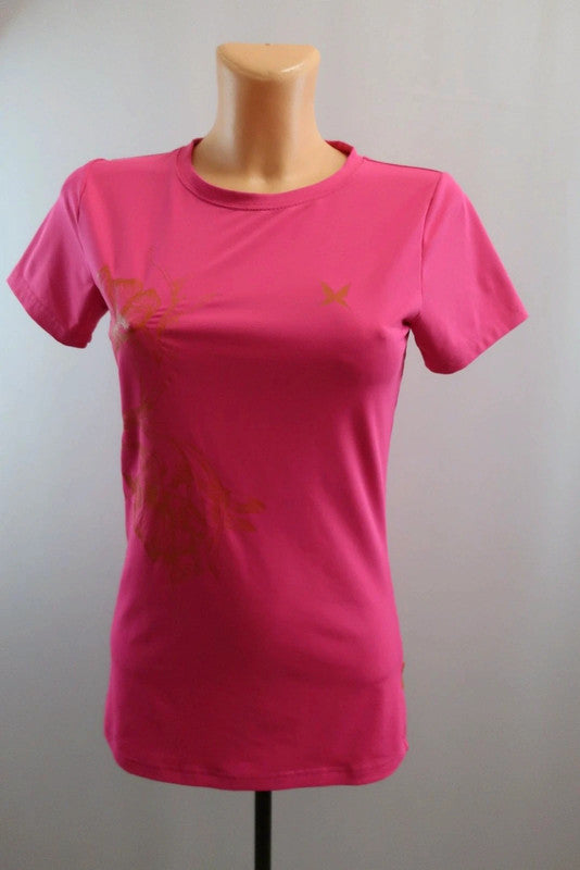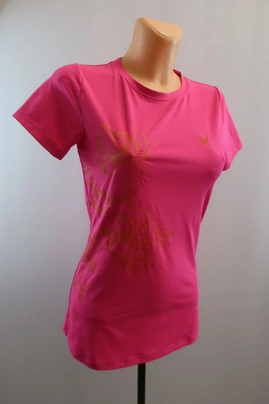 Karitraa moteriški sportiniai marškinėliai S dydis Puikiai tiks bet kokiai aktyviai veiklai - sportui, bėgimui, laisvalaikiui. .Kokybiški, lengvi, patogūs - nevaržo judesių. Spalva - rožinė, puošta raštais. Audinys tamprus.